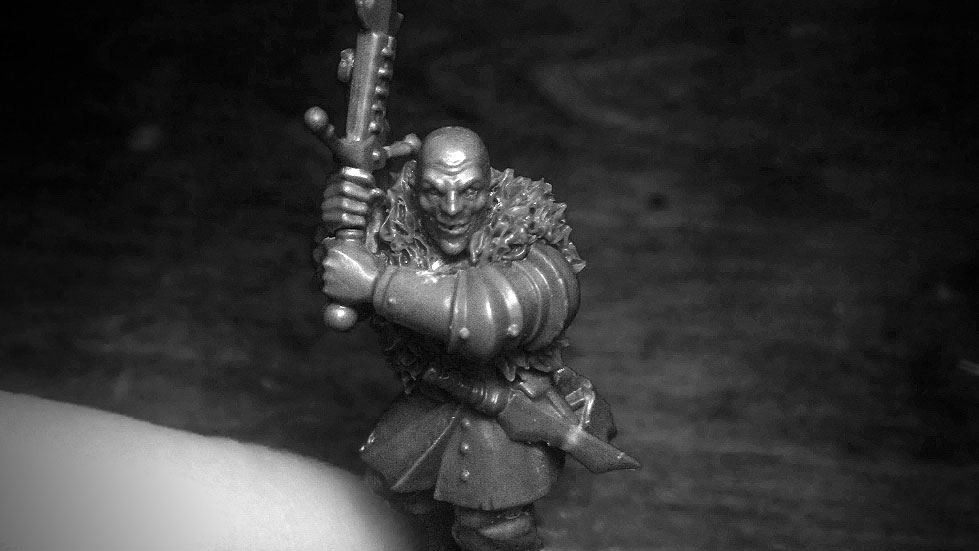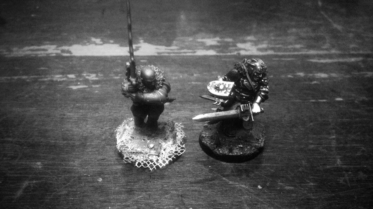 The new addition looks great. I love the subtle resculpt of his face. Is that a Flagellant head? Regarding the greyscale vs colour pictures; I actually like to see both. The greyscale makes it much easier to see the whole effect of the conversion, but as someone who’s still a relative novice at this, I can learn a lot by studying how others have achieved their results. I’m currently working on a project involving art-scale marines and I spent a long time studying your Red Corsairs and Migs’ Alpha Legion before beginning. It was a big help and learning from your techniques is helping me get results much better than I hoped for.