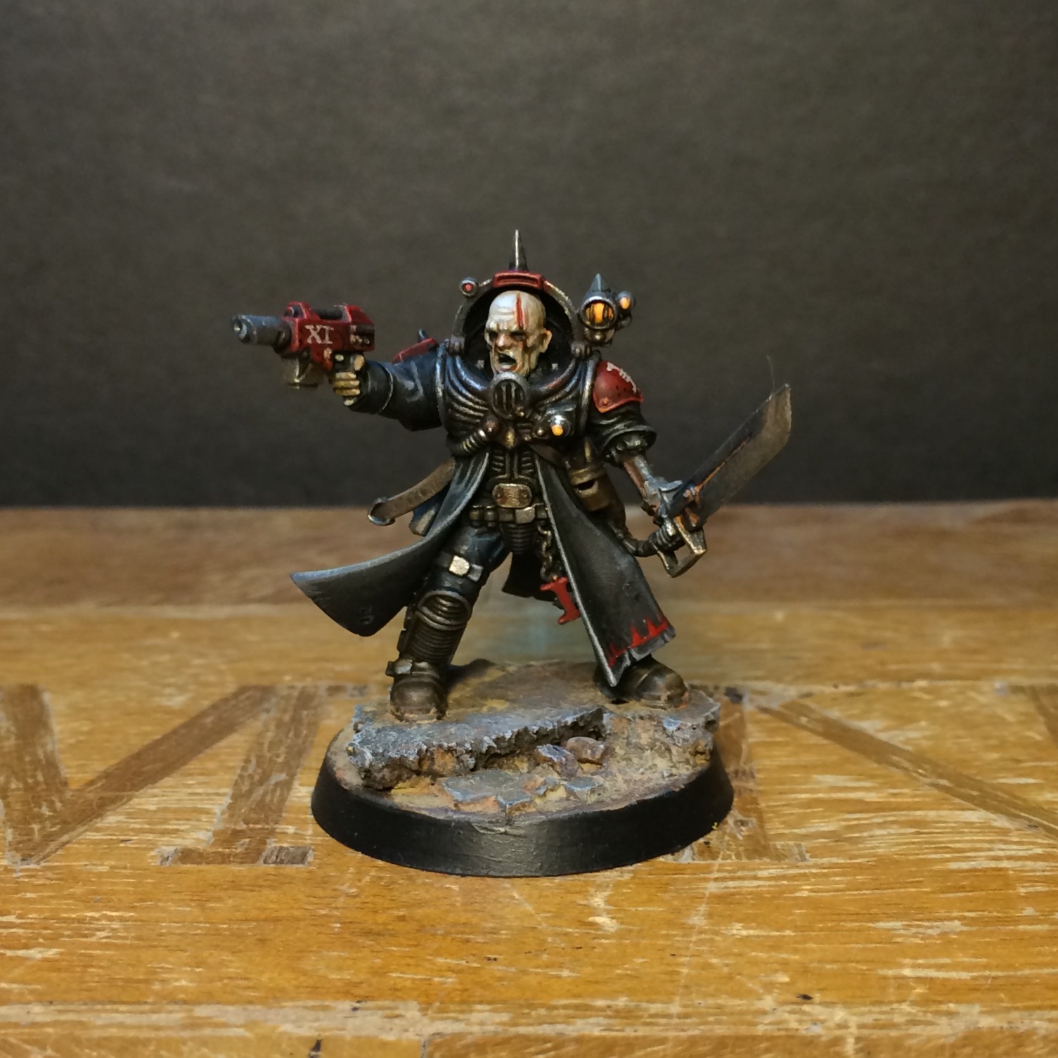 2. Wonderful looking model! The heavy coat and body armor just scream the Inquisition in my mind. I also really like how you decided to give him a laspistol, a fitting choice. Your paint job of the model is really striking, the deep red and black work perfectly together. Your freehand work looks fantastic too; I love the Order’s emblem on his right shoulder guard.