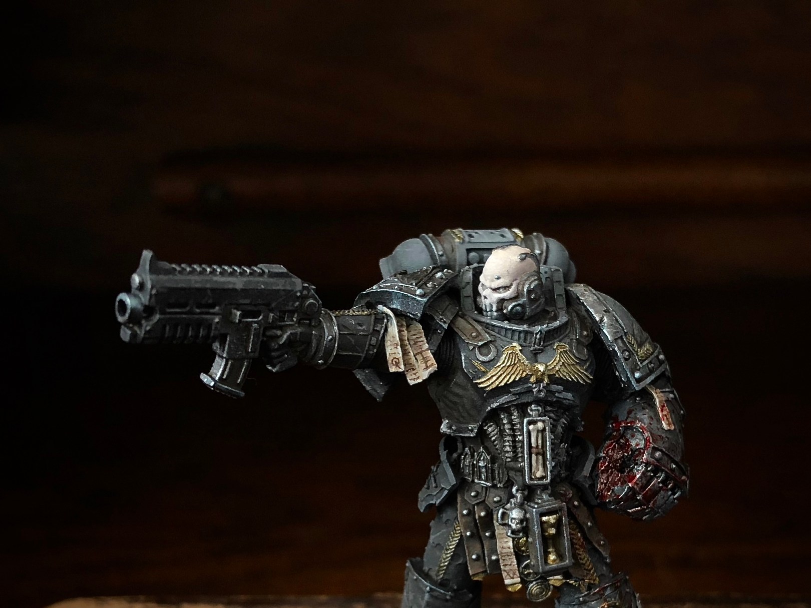 First of many, the specialist, which I finished with passion, painting every little moment I could escape the mayhem of real life to my little grim dark corner. This is perhaps the most grim dark model I’ve ever made, somehow the essence of how I see the hobby. My description of it in miniature form. (I’ll need to come back to figure out how to show the skin, it’s completely washed out around all that non black black, which also appears grayer in images, despite my best camera trickery.)