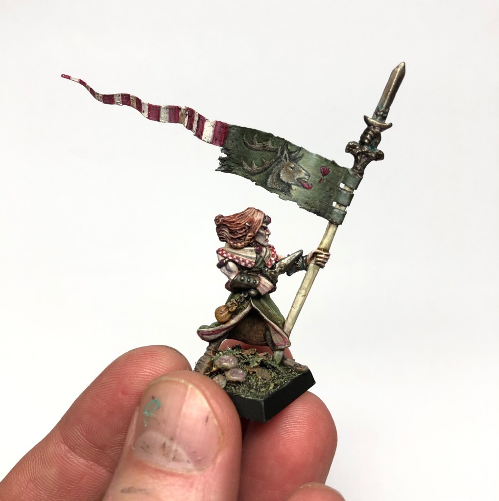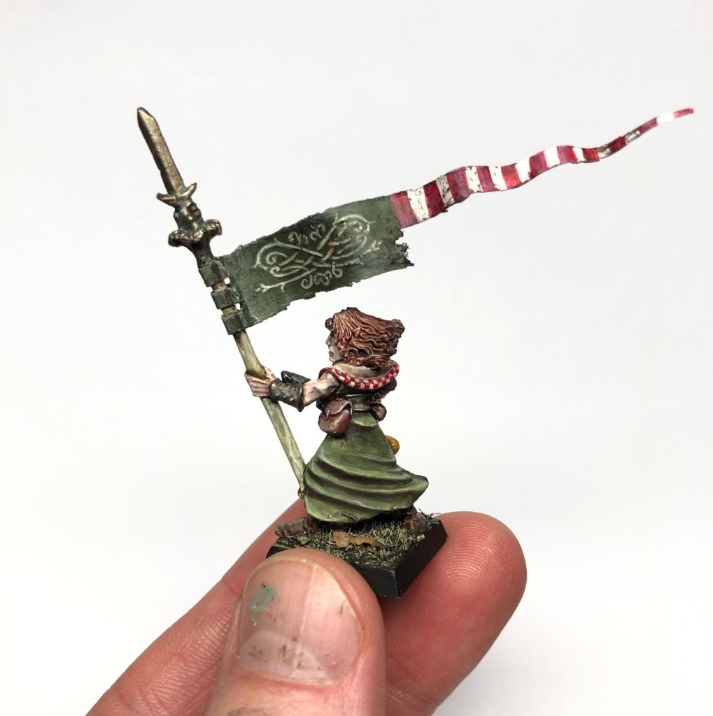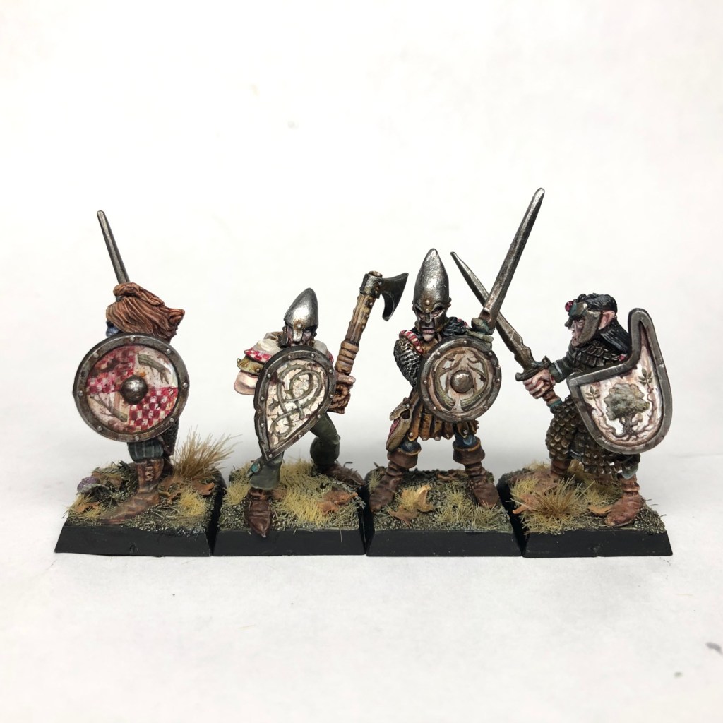 The theme of the army varies between units. The bonding will happen with the style and palette I’m using. For example the fighters are a random bunch of elves with different sort of weapons (axes, swords, spears etc.), so I thought of giving them somewhat mismatching uniforms. There are some small details that help to bind them together though, like red-white checkers patterns on their hoods and red-white trims on their chainmails, for example. Worn green will of course eventually work as a general colour to bind the whole force together.